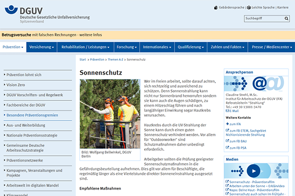 Dieses Online-Angebot bietet Ihnen fundierte Informationen zu möglichen Gesundheitsgefahren durch die Einwirkung natürlicher UV-Strahlung bei Arbeiten im Freien. Zudem erhalten Sie Hinweise, wie Sie sich durch geeignete Schutzmaßnahmen vor diesen Gefahren schützen können, um insbesondere das Risiko von Haut- und auch Augenschäden zu verringern.