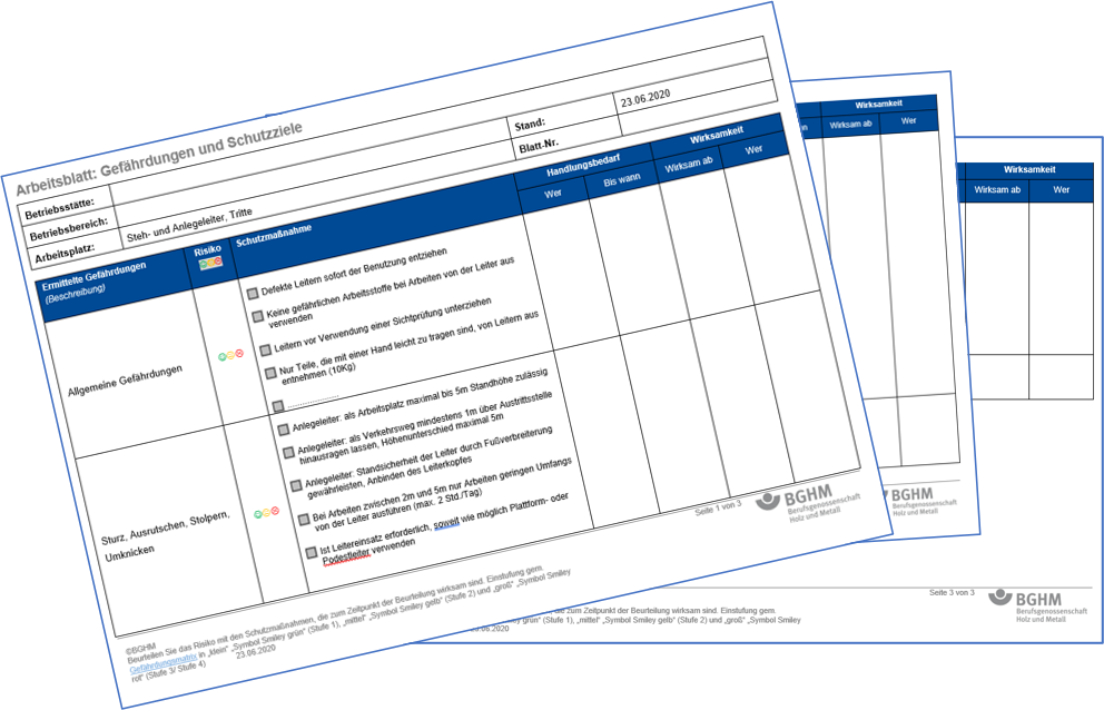 Die Dokumentation der Gefährdungsbeurteilung nach § 6 Arbeitsschutzgesetz erfordert keine bestimmte Art von Unterlagen. Dokumentationen auf elektronischer Basis und in Schriftform sind gleichwertig. Die Überprüfbarkeit der Gefährdungsbeurteilung durch die Aufsichtsperson der BGHM oder eine staatlichen Arbeitsschutzbehörde muss aber jederzeit gewährleistet sein. Mindestens zu dokumentieren ist: