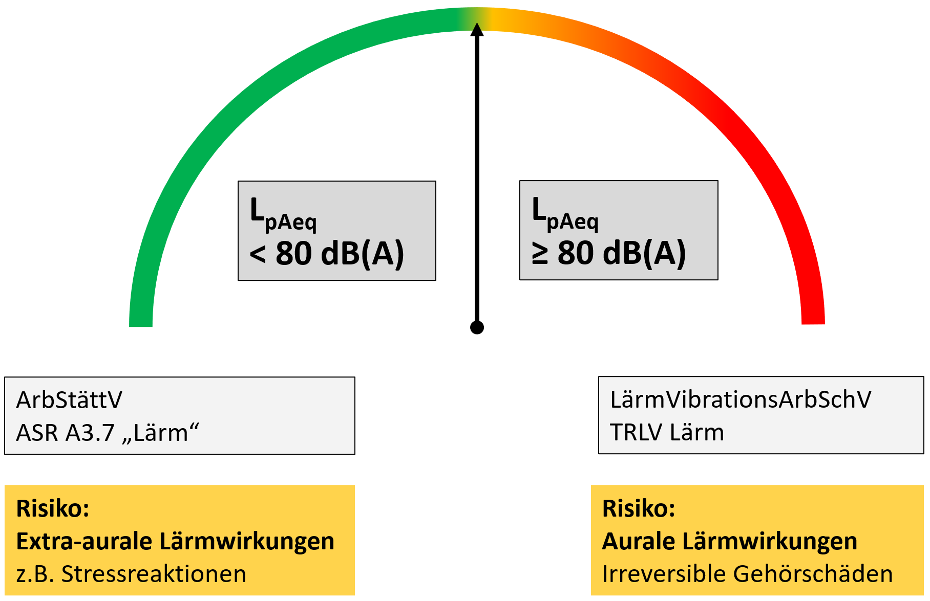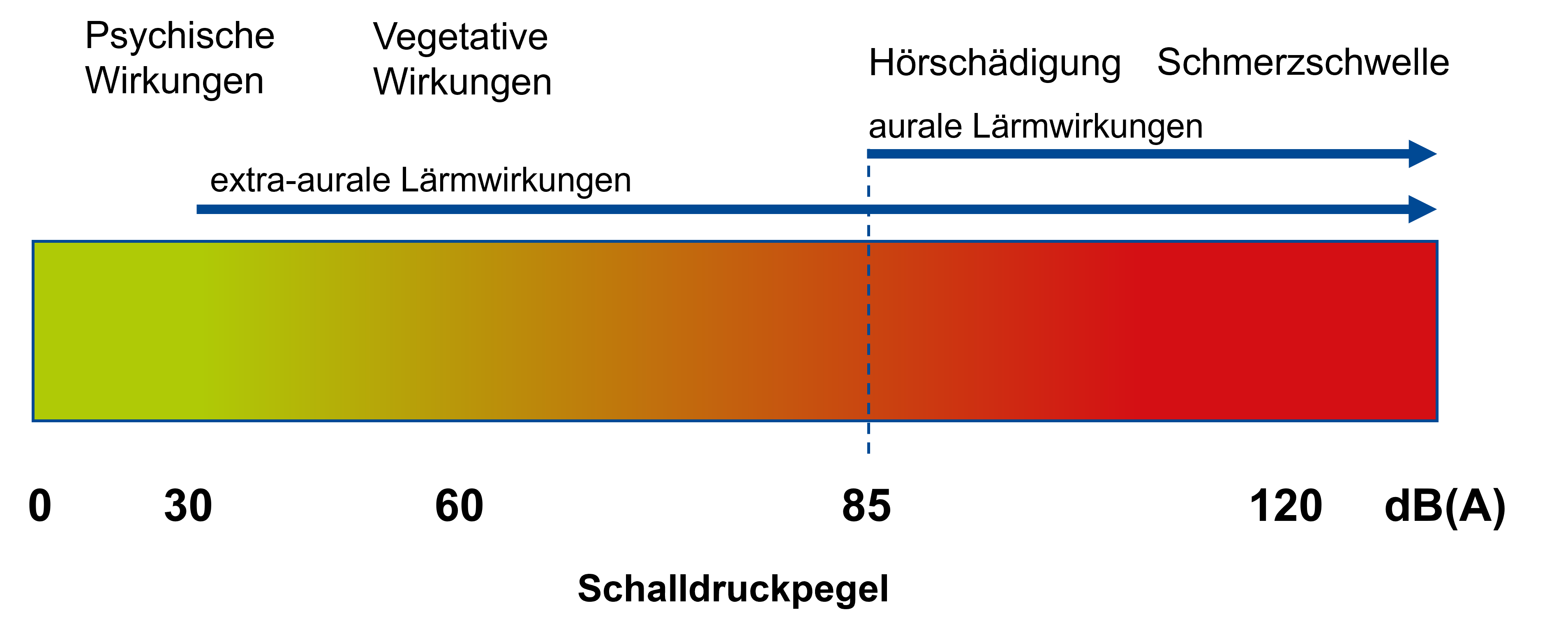 Unterhalb der Pegelgrenze 80 dB(A) können durch Lärm sogenannte extra-aurale Lärmwirkungen, wie zum Beispiel Stressreaktionen, entstehen. Oberhalb der Pegelgrenze von 85 dB(A) kommt ein Risiko für irreversible Gehörschäden hinzu.