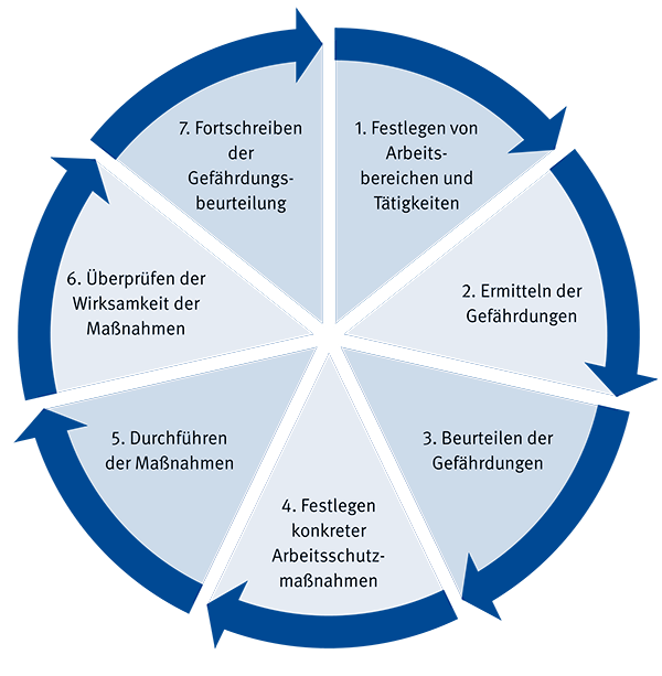 Entsprechend der GDA-Leitlinie „Gefährdungsbeurteilung und Dokumentation“ sind bei der Gefährdungsbeurteilung sieben Schritte zu planen und umzusetzen.
