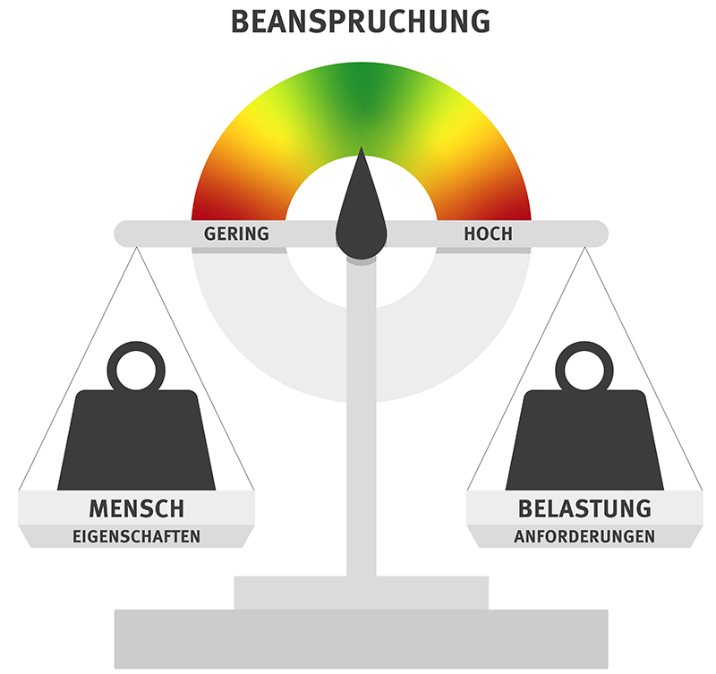 Im Rahmen der Gefährdungsbeurteilung ist die Unterscheidung zwischen den arbeitswissenschaftlichen Begriffen "Belastung" und "Beanspruchung" zentral. Die unterschiedlichen "Eigenschaften der Personen" spielen dabei eine wichtige Rolle. Alle drei Faktoren wirken zusammen.
