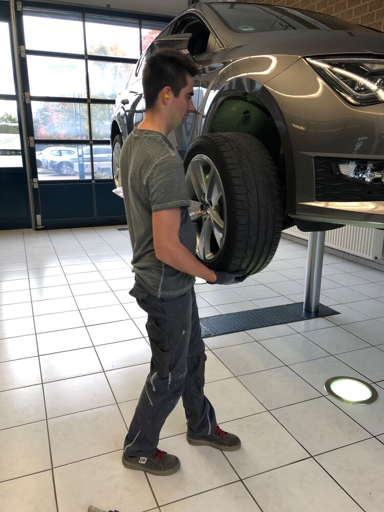 In diesem Beispiel gehen wir davon aus, dass je Schicht und beschäftigte Person Räder 60 Mal angehoben werden. Dies beinhaltet Demontage, Wuchten, Lagerung, Reinigung und Montage der Räder. Dabei treten Lastgewichte von ca. 18–26 kg je Komplettrad auf.